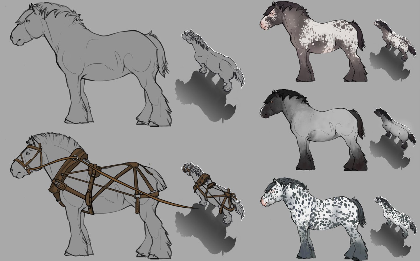 A draft horse breed concept for Dreamthorn: I chose feathered draft breeds for their top-down readability and versatility as working, riding, and war mounts. Coat colors are grounded in real genetics, selected to deliver fantasy appeal and visual variation while maintaining breed believability.