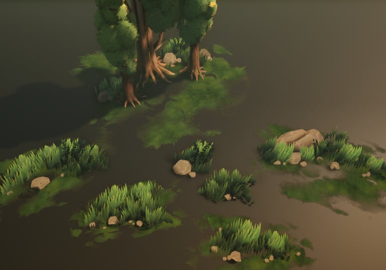Enhancing lighting direction with a shader-driven faux lighting layer and post-process to push readability, silhouette clarity and scene depth for a top-down view.