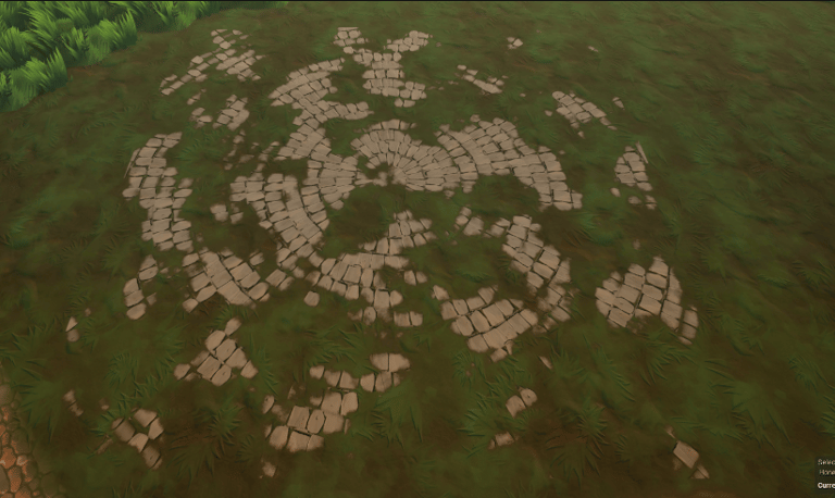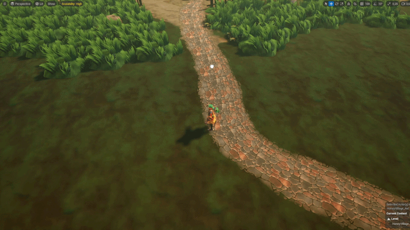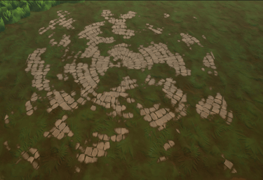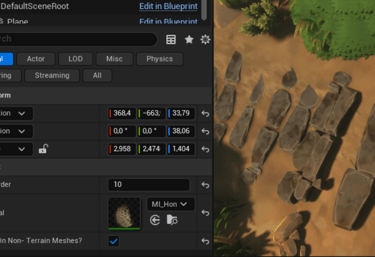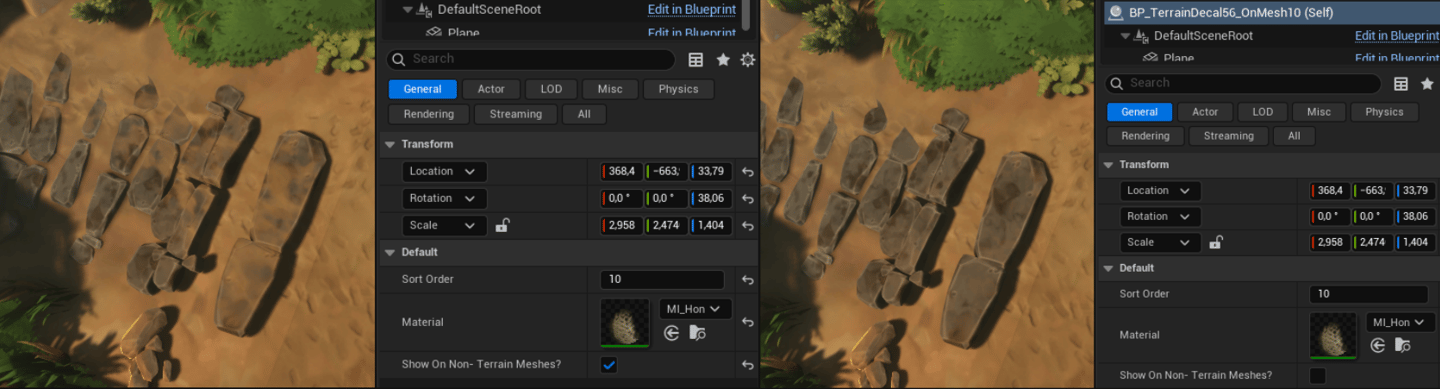 The setup uses simple plane actors excluded from the main render pass that writes the decal material into the terrain color RVT. The terrain & ground props sample the result, allowing decal-like sorting through translucency sort order & with a choice to show a decal over or under ground props..